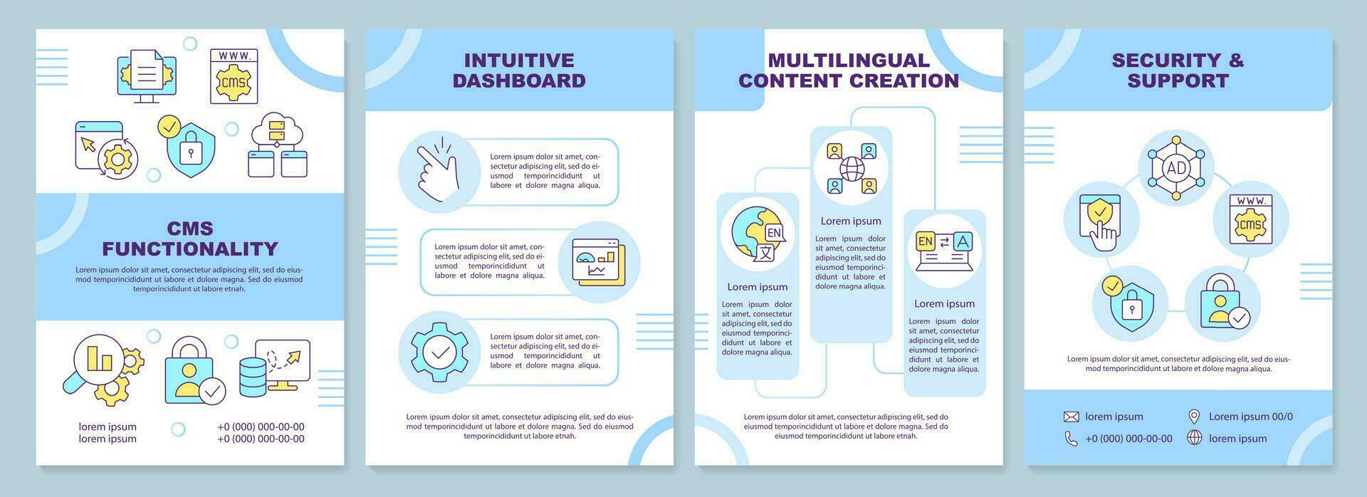 CMS functionality blue brochure template. Platform instruments. Leaflet design with linear icons. Editable 4 vector layouts for presentation, annual reports Pro Vector