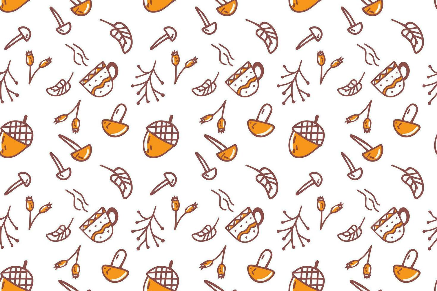 Pattern, background from a set of autumn elements, mushrooms, leaves, acorn. Autumn doodle is a seamless pattern on a white background. Pro Vector