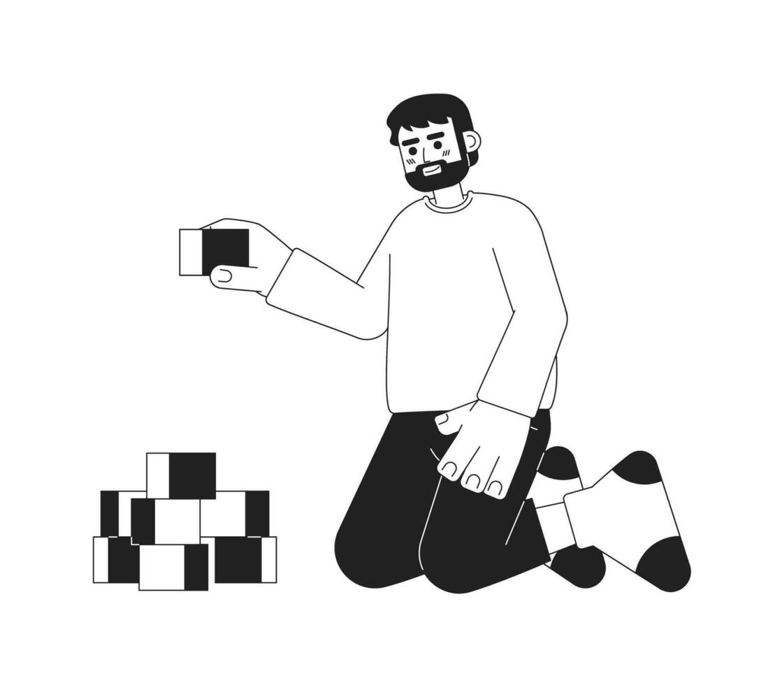 Happy bearded father playing with constructor cubes monochromatic flat vector character. Dad stacking blocks. Editable thin line person on white. Simple bw cartoon spot image for web graphic design Pro Vector