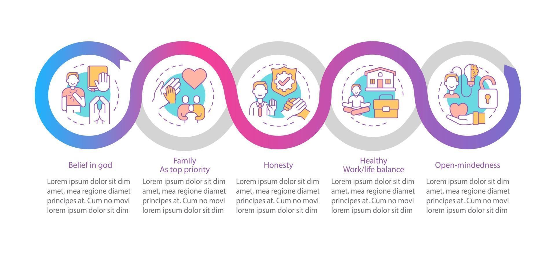 Personal beliefs vector infographic template. Belief in god, honesty presentation design elements. Data visualization with 5 steps. Process timeline chart. Workflow layout with linear icons Pro Vector