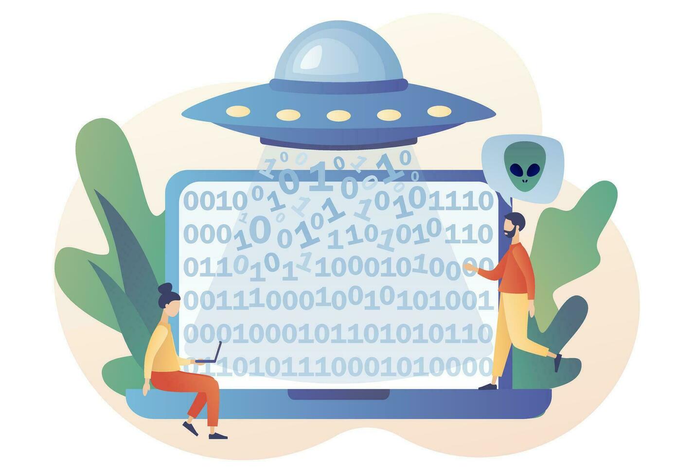 UFO spaceship with ray of light abducts data computer. World Contact day. Space concept. Alien. Futuristic unknown flying object. Modern flat cartoon style. Vector illustration on white background Pro Vector