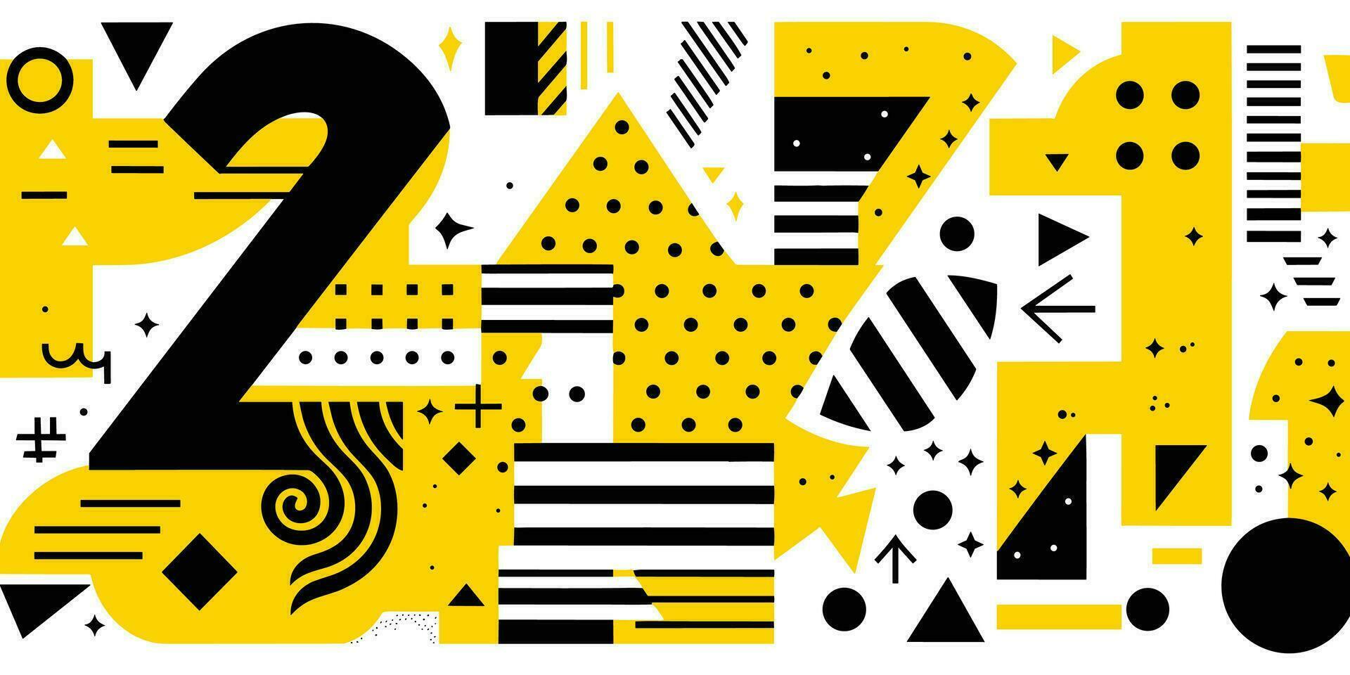 geometric shapes and yellow letters in flat style, in the style of stripes and shapes, line and dot work, minimalist figures, memphis design, zigzags, minimalist backgrounds, symbolic elements Free Vector