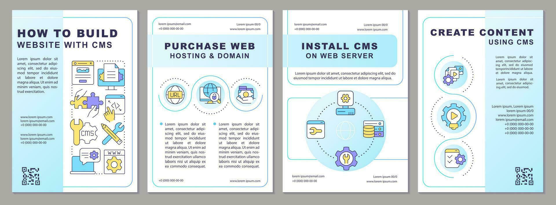 Building website with CMS blue brochure template. Digital tools.. Leaflet design with linear icons. Editable 4 vector layouts for presentation, annual reports Pro Vector