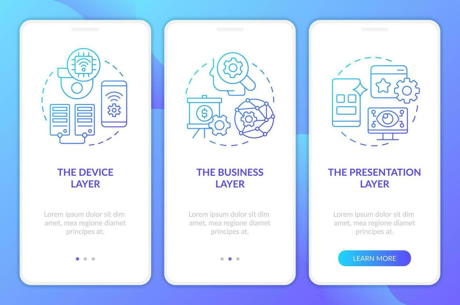 IoT applications layers blue gradient onboarding mobile app screen. Walkthrough 3 steps graphic instructions with linear concepts. UI, UX, GUI template Pro Vector