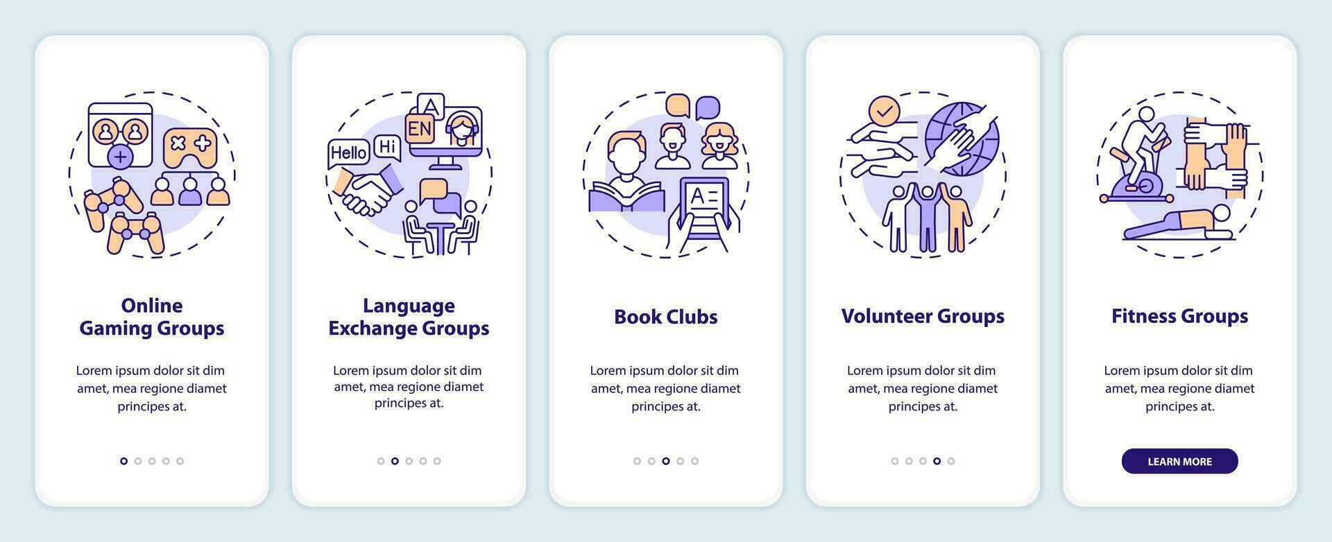 Micro communities examples onboarding mobile app screen. Small group walkthrough 5 steps editable graphic instructions with linear concepts. UI, UX, GUI template Pro Vector