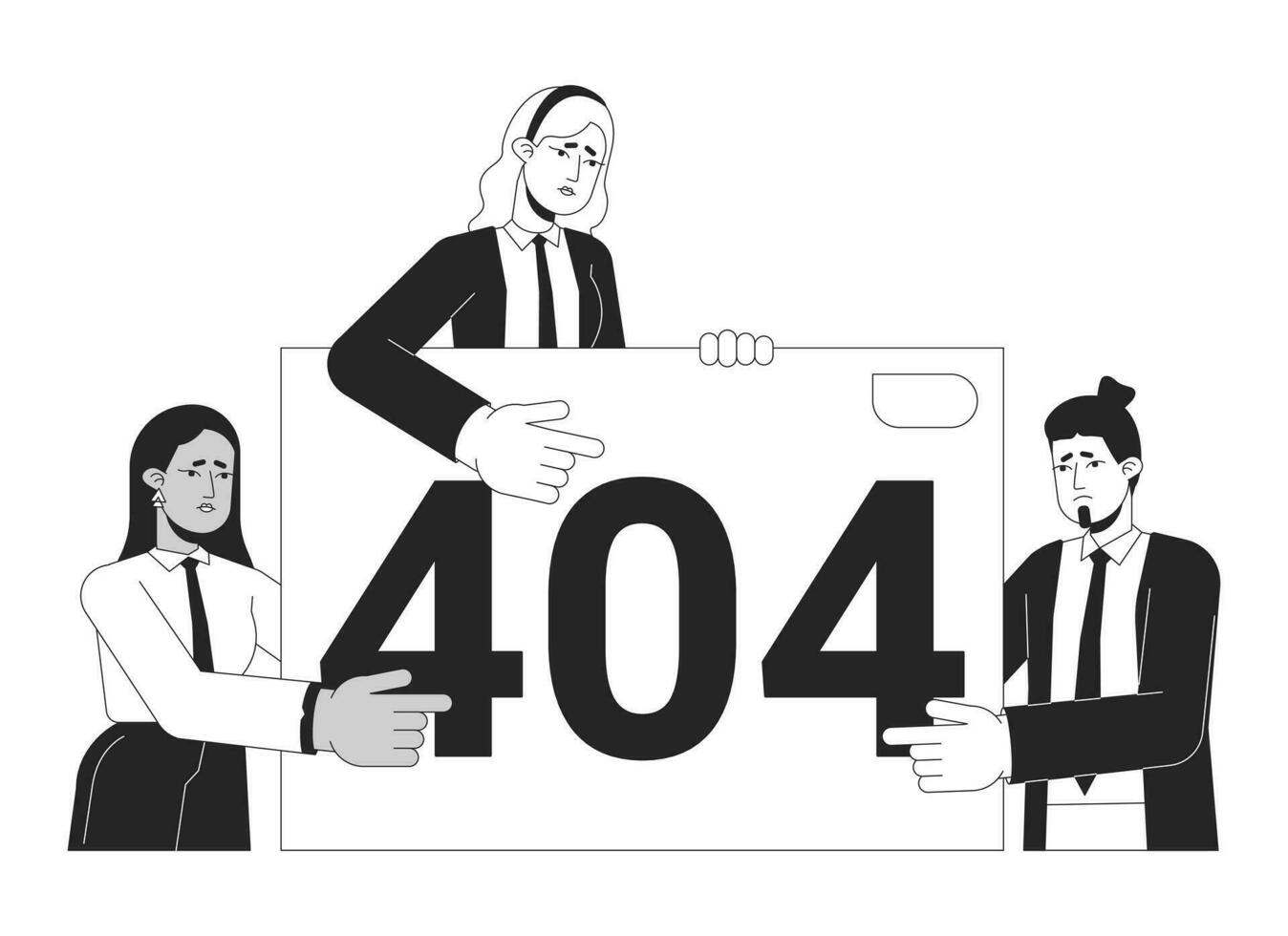 Businesspeople presentation failure black white error 404 flash message. Upset team. Monochrome empty state ui design. Page not found popup cartoon image. Vector flat outline illustration concept Pro Vector