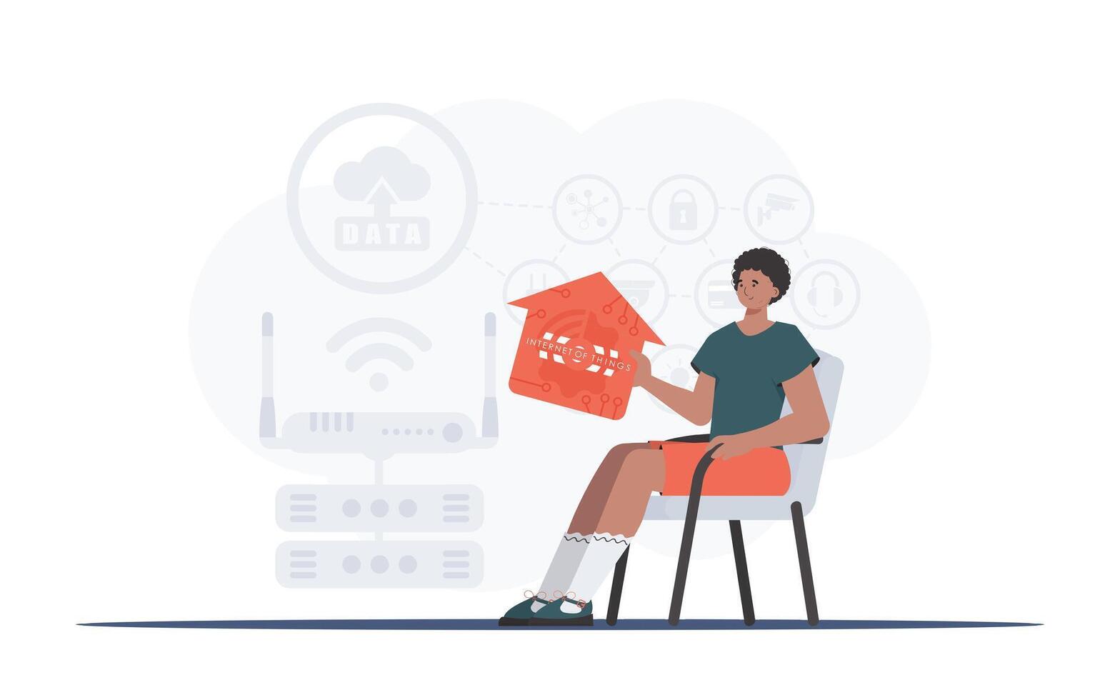 Internet of things and automation concept. A man sits in an armchair and holds a house icon in his hands. Good for websites and presentations. illustration in flat style. Pro Vector