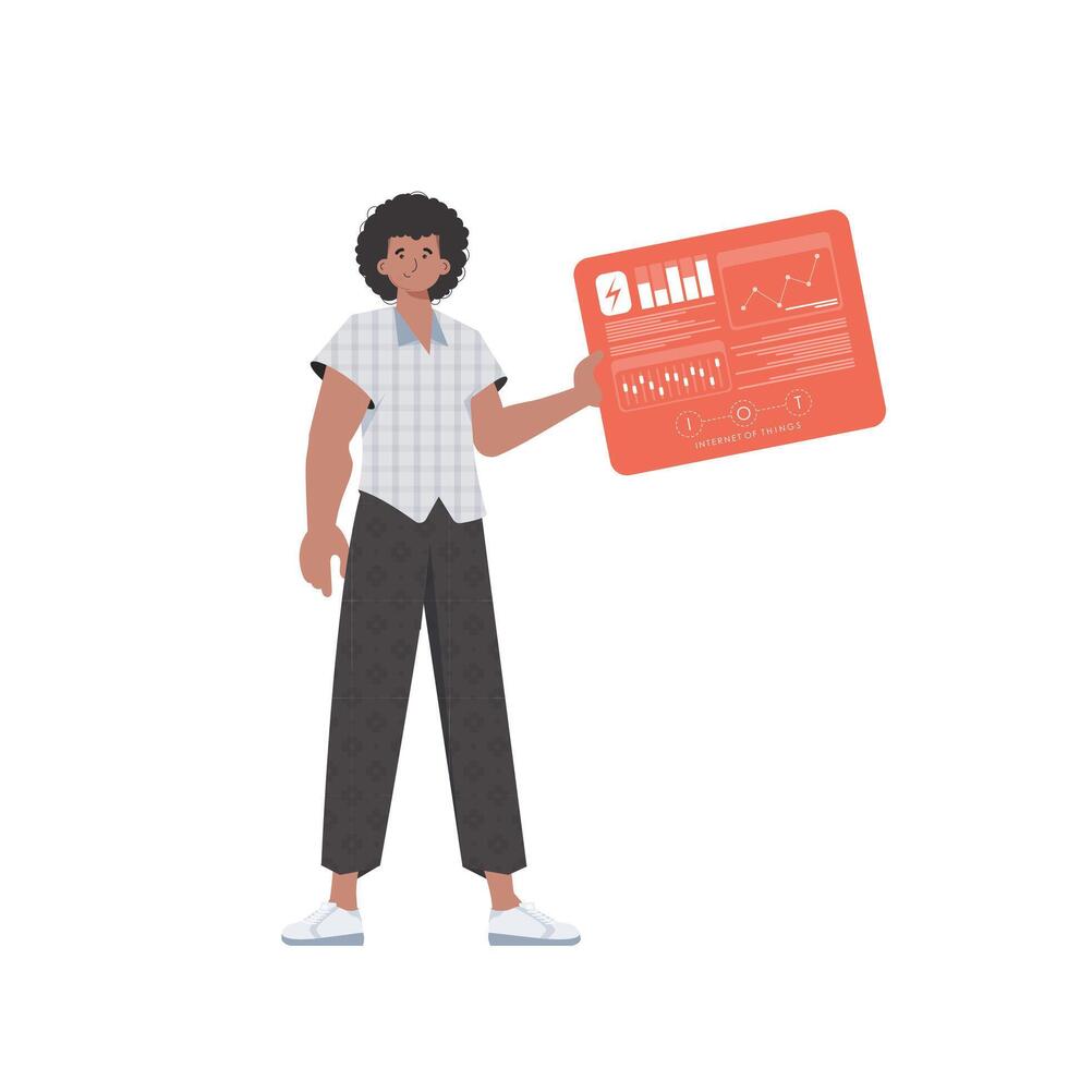 A man holds a panel with analyzers and indicators in his hands. IOT and automation concept. Isolated. illustration in trendy flat style. Pro Vector