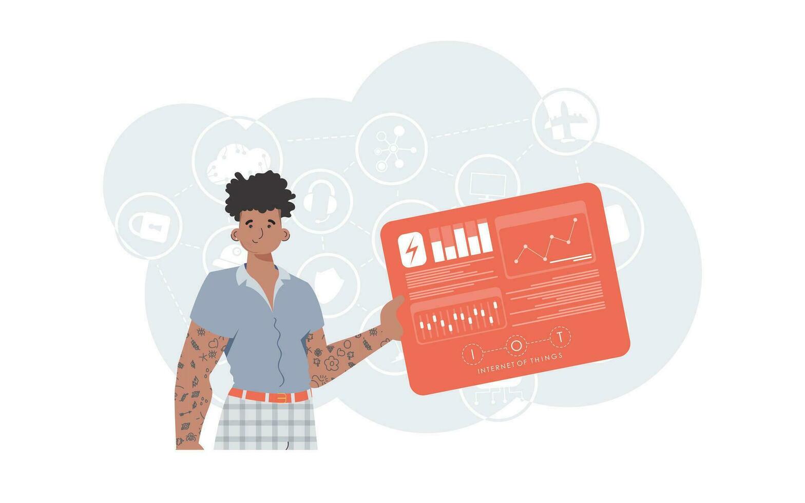 Internet of things concept. A man holds a panel with analyzers and indicators in his hands. Good for websites and presentations. Trendy flat style. . Pro Vector
