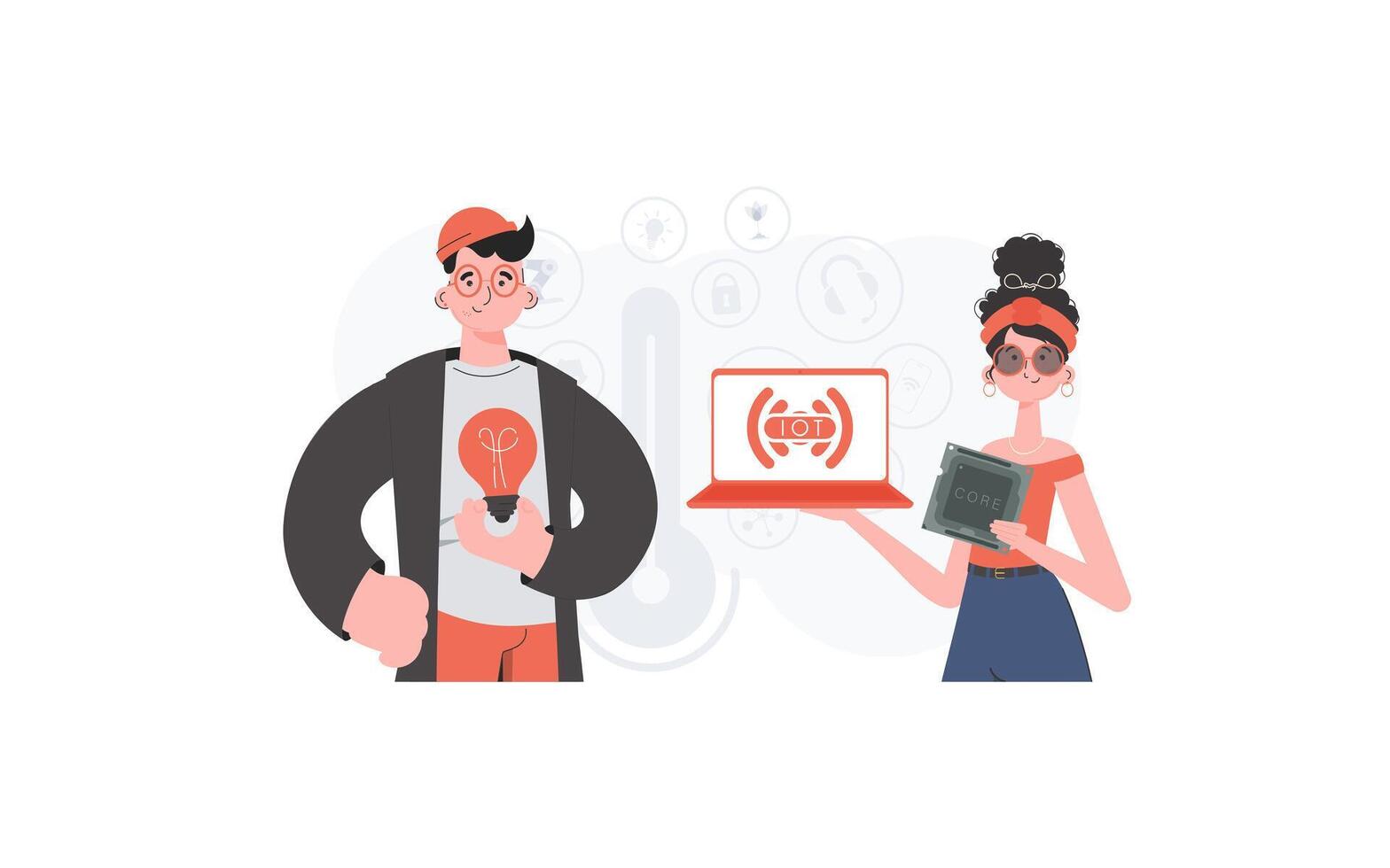The girl and the guy are a team in the field of Internet of things. IoT concept. Good for websites and presentations. Vector illustration. Pro Vector
