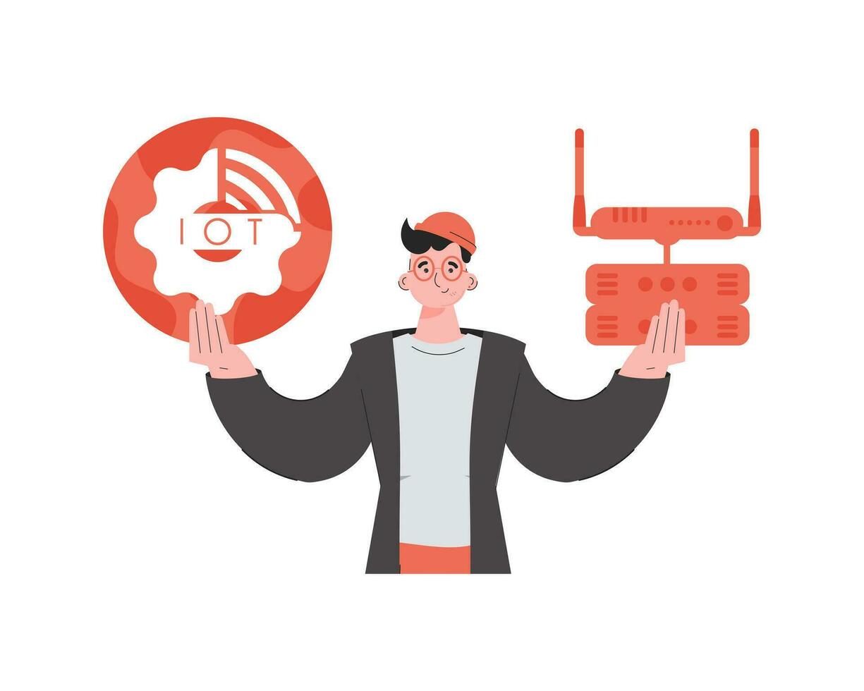 A man holds the internet of things logo in his hands. Router and server. Internet of things concept. Isolated. illustration in flat style. Pro Vector