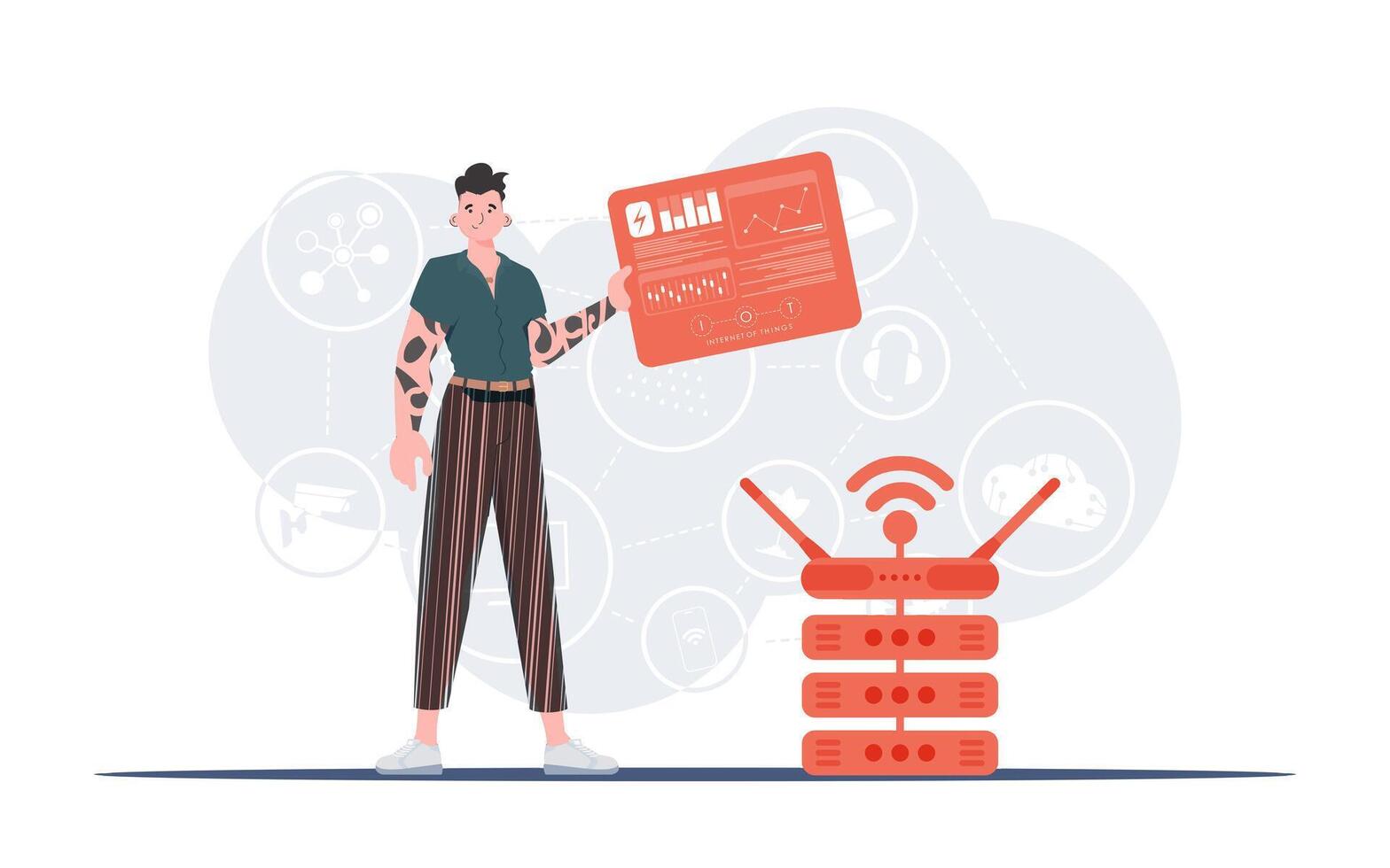 IOT and automation concept. A man holds a panel with analyzers and indicators in his hands. Good for websites and presentations. Trendy flat style. . Pro Vector
