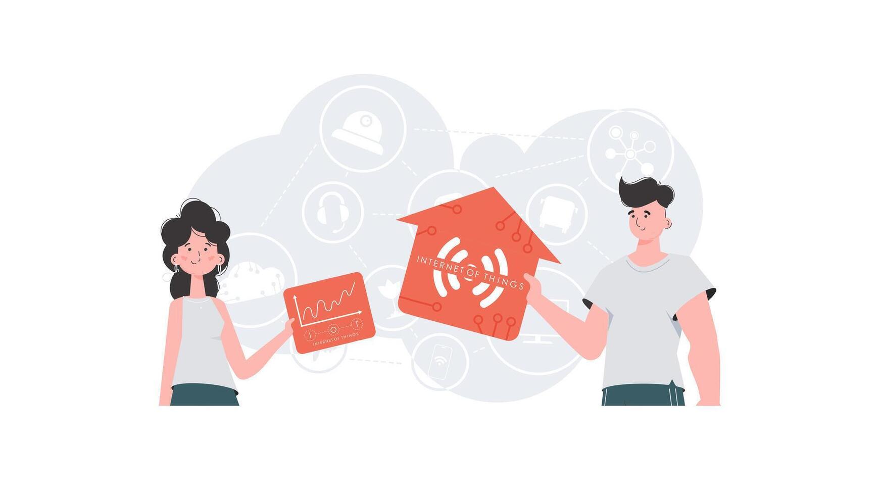IoT concept. A man and a woman are a team in the field of the Internet of things. Good for presentations and websites. illustration in flat style. Pro Vector