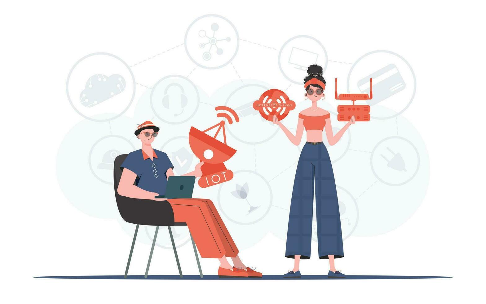 Internet of things and automation concept. The girl and the guy are a team in the field of IoT. Good for websites and presentations. Vector illustration in trendy flat style. Pro Vector
