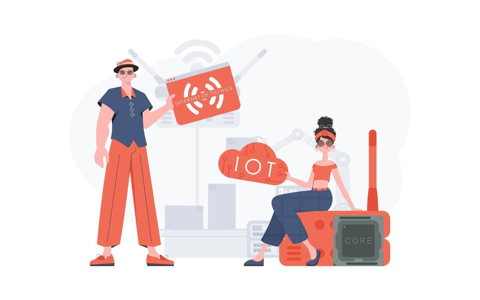 A man and a woman are a team in the field of the Internet of things. Internet of things and automation concept. Good for presentations and websites. Vector illustration in trendy flat style. Pro Vector