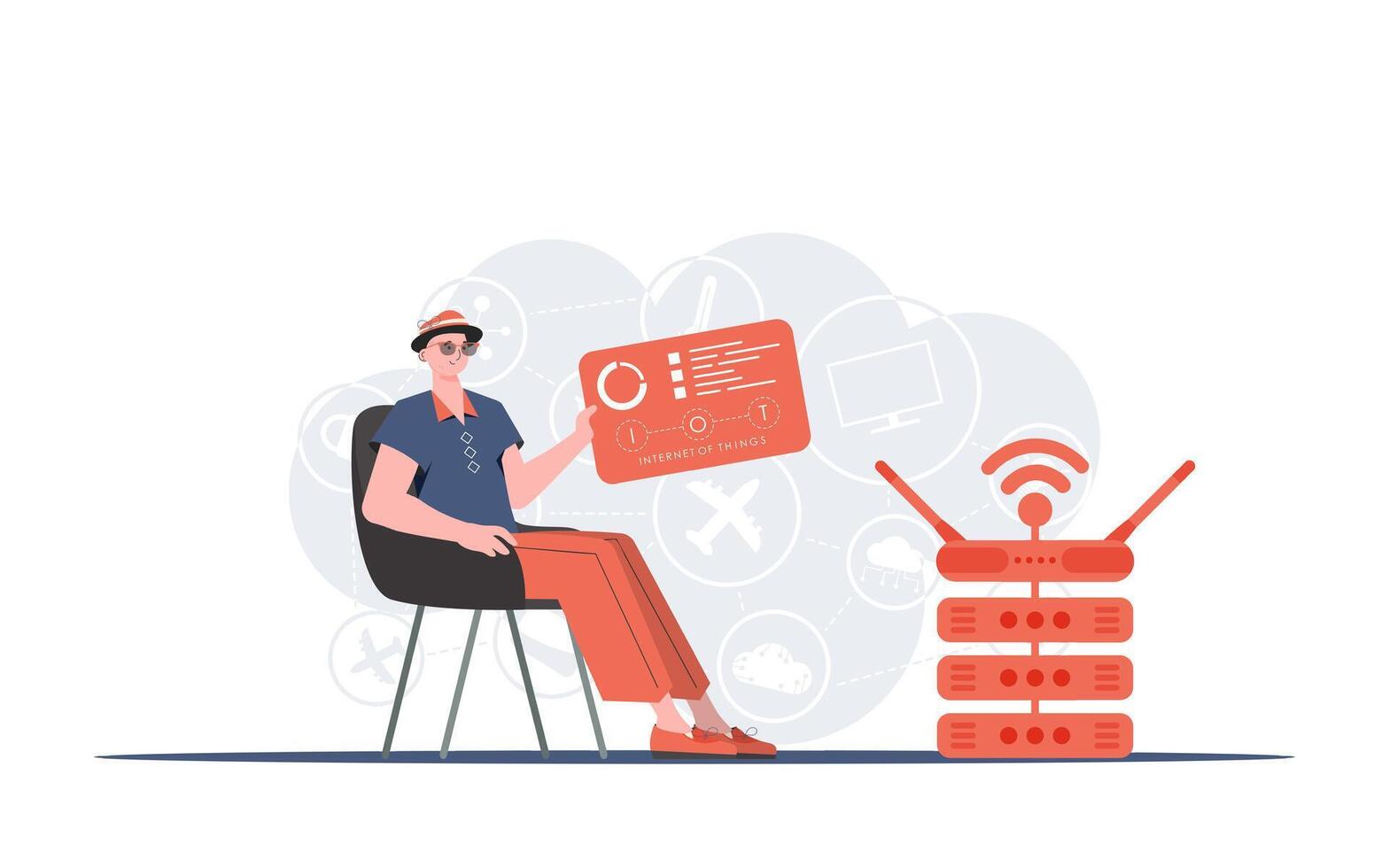 Internet of things concept. A man sits in a chair and holds a panel with analyzers and indicators in his hands. Good for websites and presentations. illustration. Pro Vector