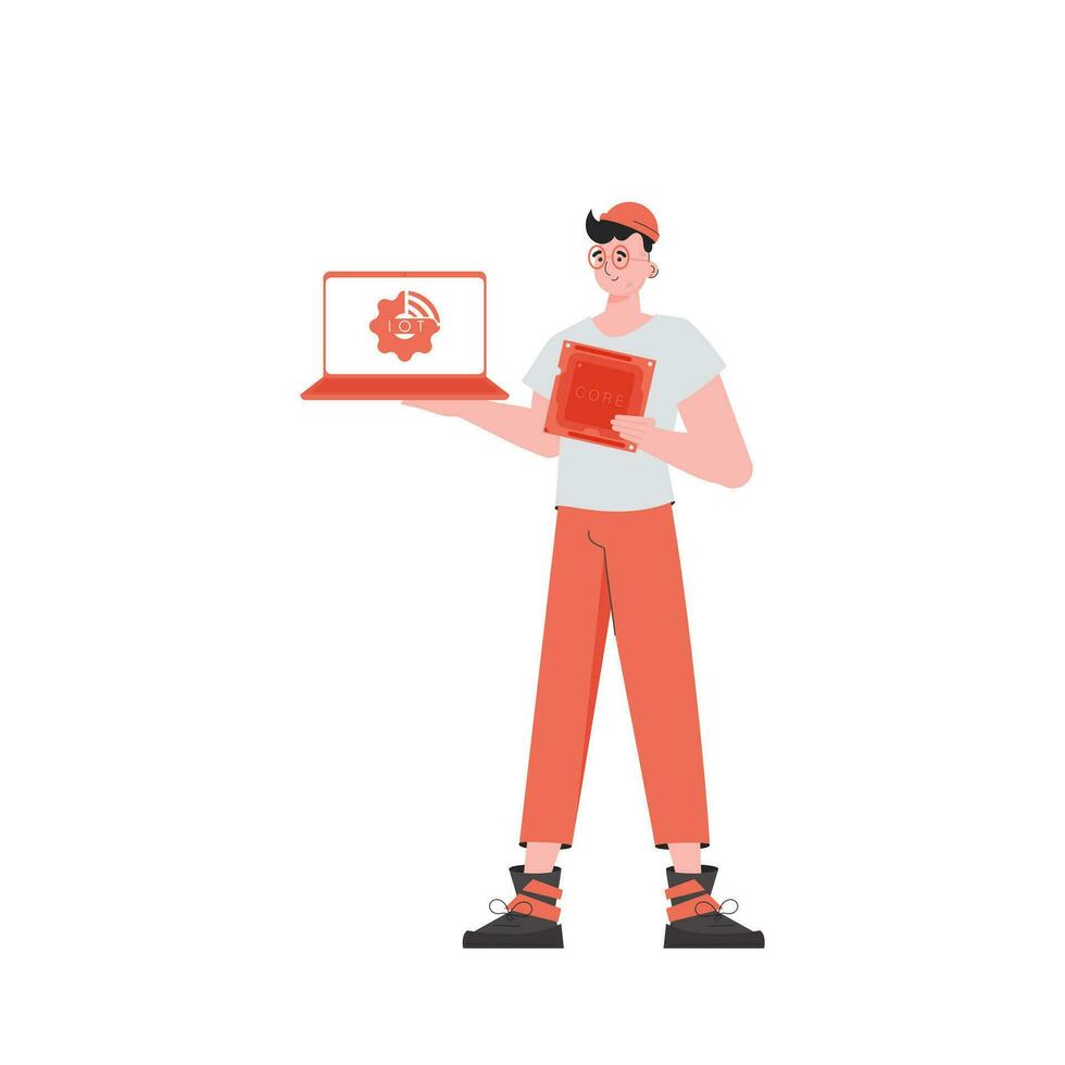 A man holds a laptop and a processor chip in his hands. IoT concept. Isolated. Vector illustration in flat style. Pro Vector