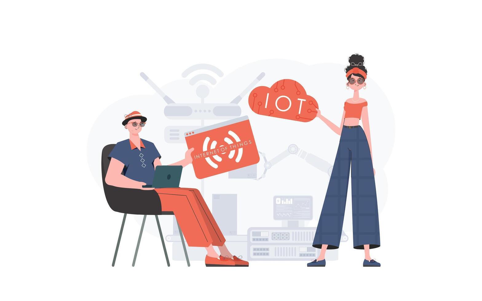 The girl and the guy are a team in the field of Internet of things. IoT concept. Good for websites and presentations. Vector illustration. Pro Vector