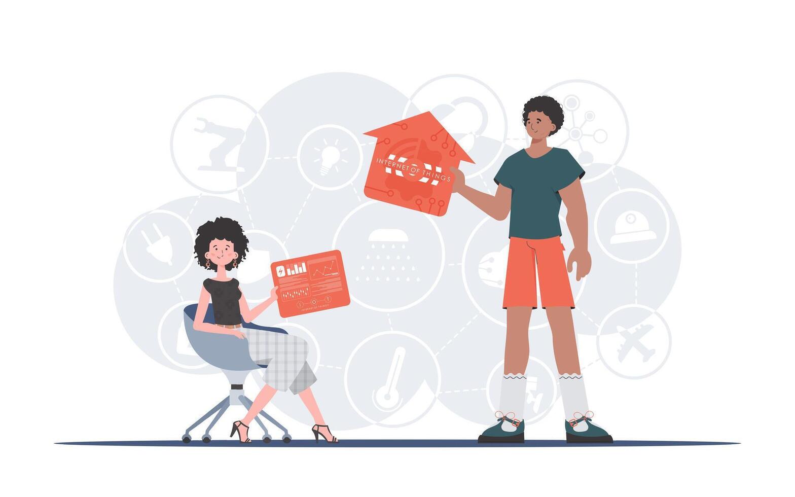 Internet of things concept. A man and a woman are a team in the field of the Internet of things. Good for websites and presentations. Trendy flat style. . Pro Vector