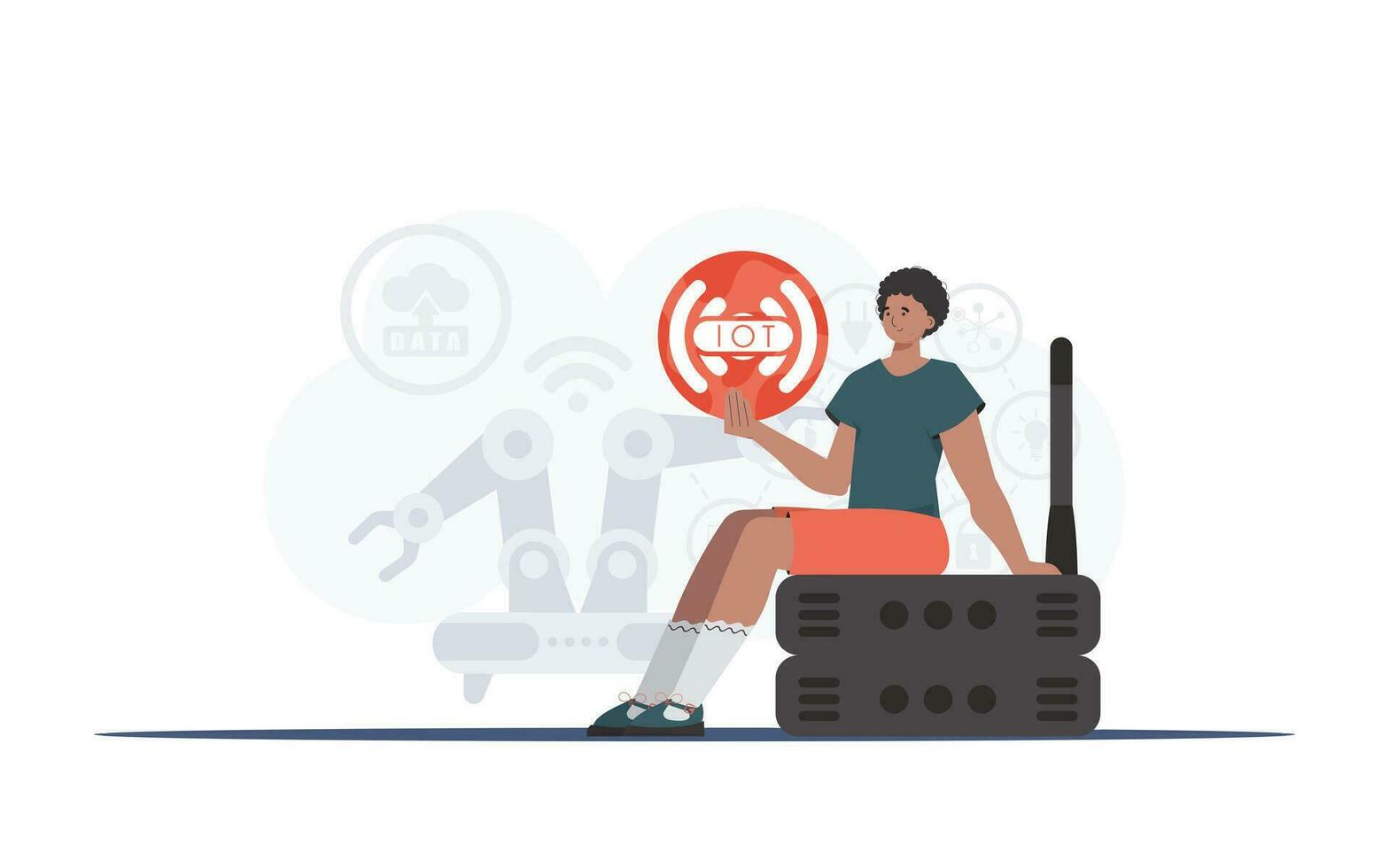 Internet of things concept. A man holds the internet of things logo in her hands. Router and server. Good for websites and presentations. illustration in trendy flat style. Pro Vector