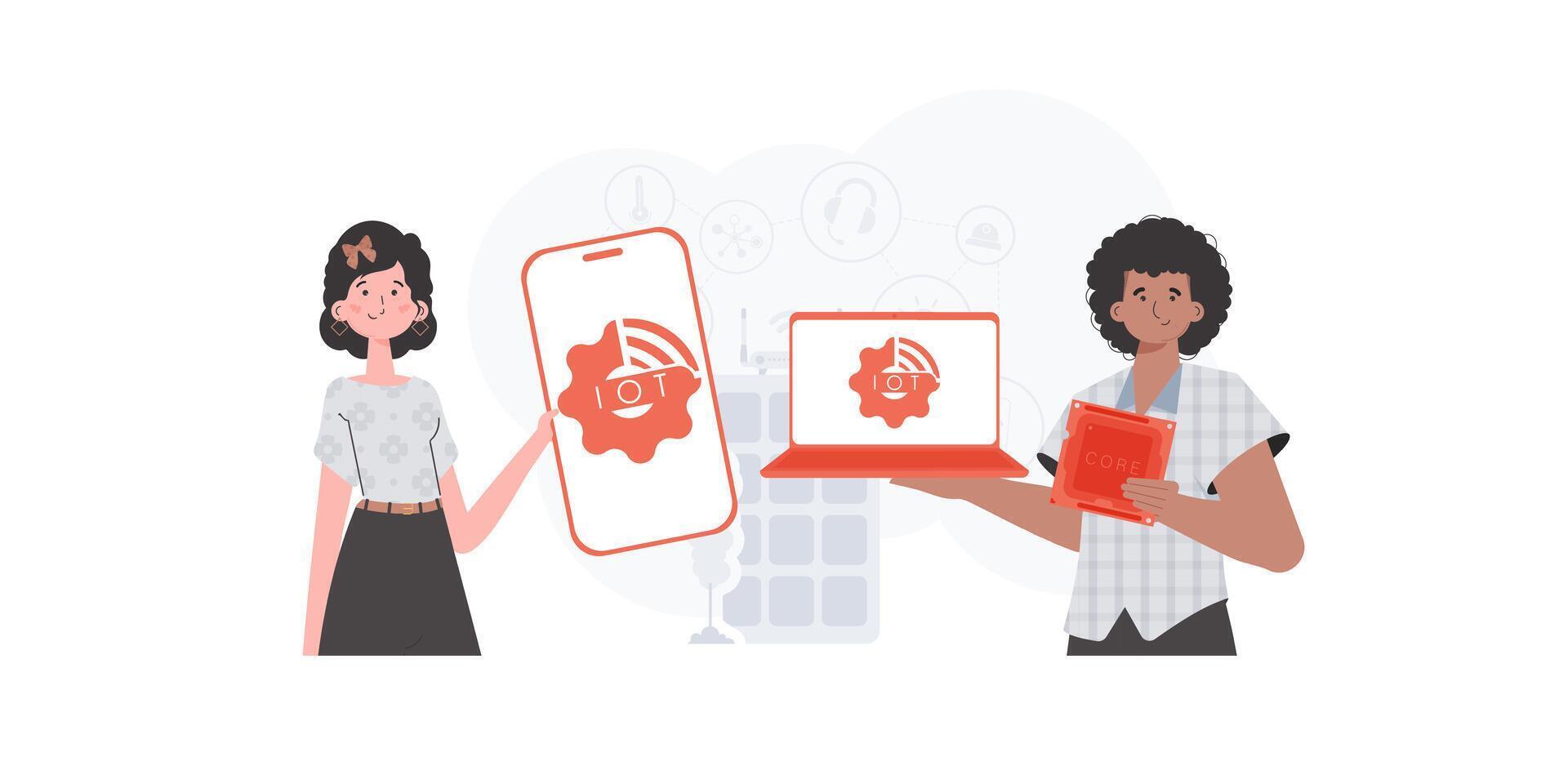 IOT and automation concept. The girl and the guy are a team in the field of IoT. Good for websites and presentations. illustration. Pro Vector