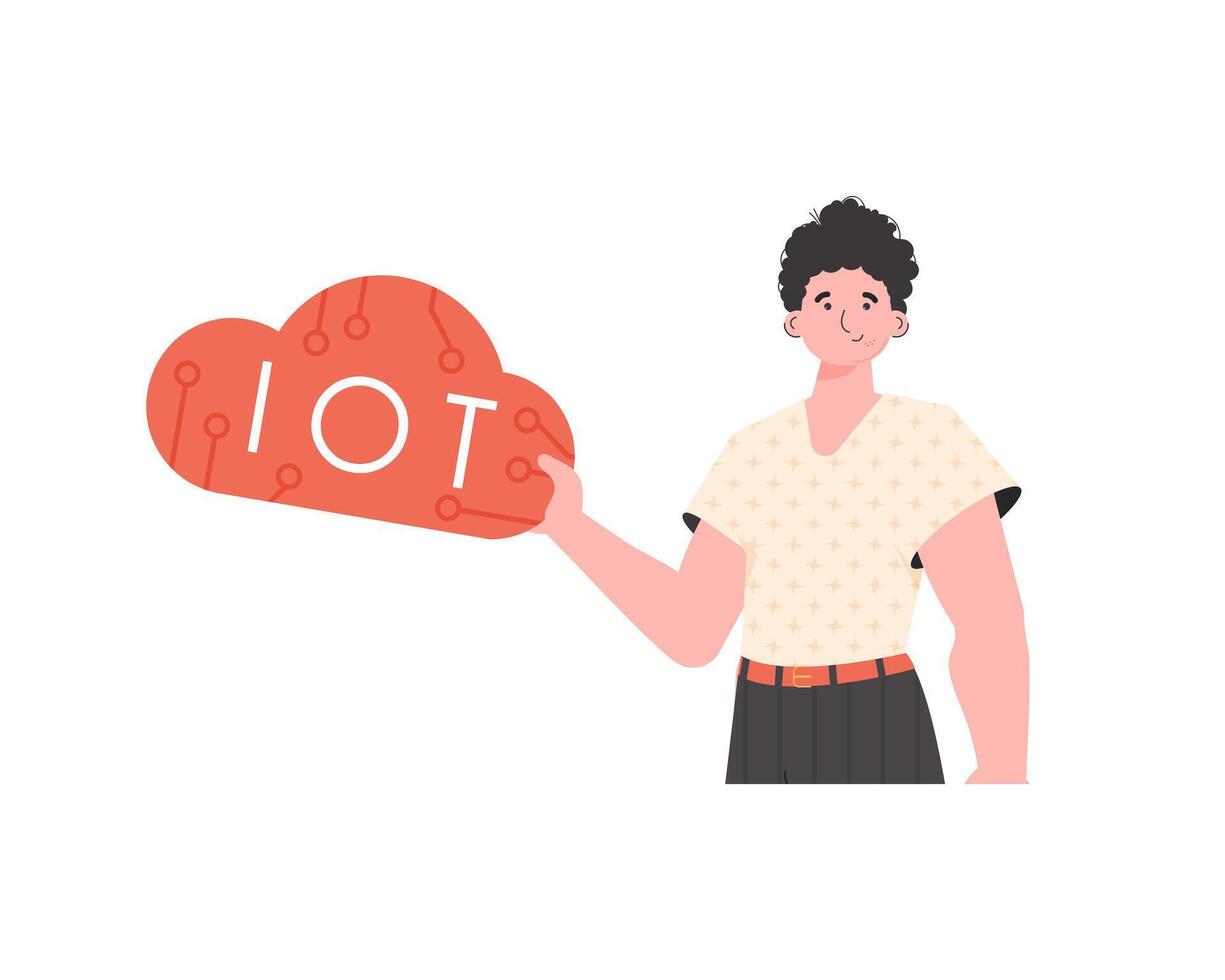 A man is holding an IoT icon in his hands. Internet of things and automation concept. Isolated. Trendy flat style. illustration. Pro Vector