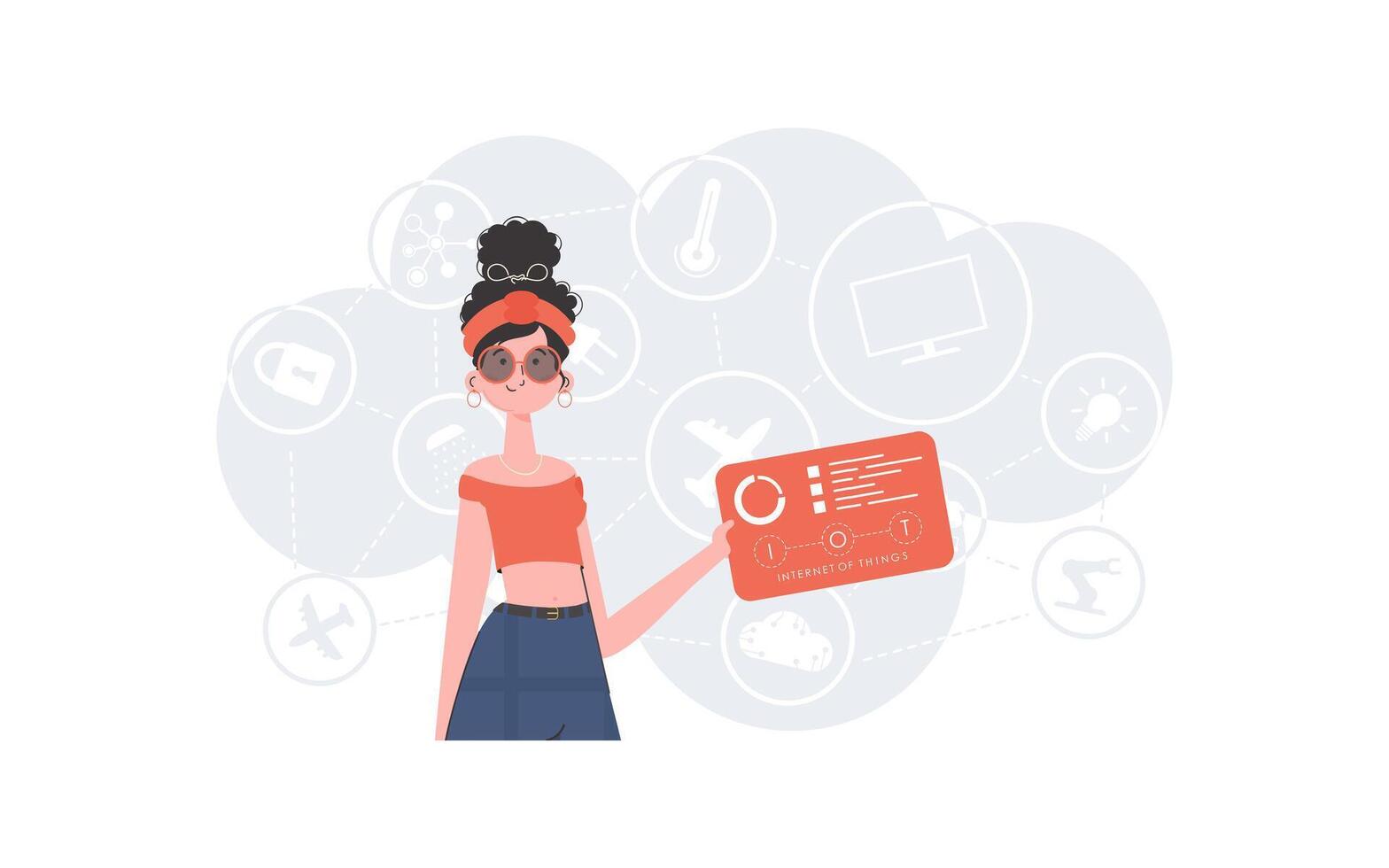 Internet of Things and Automation Concept. A woman holds a panel with analyzers and indicators in her hands. Good for websites and presentations. illustration in flat style. Pro Vector