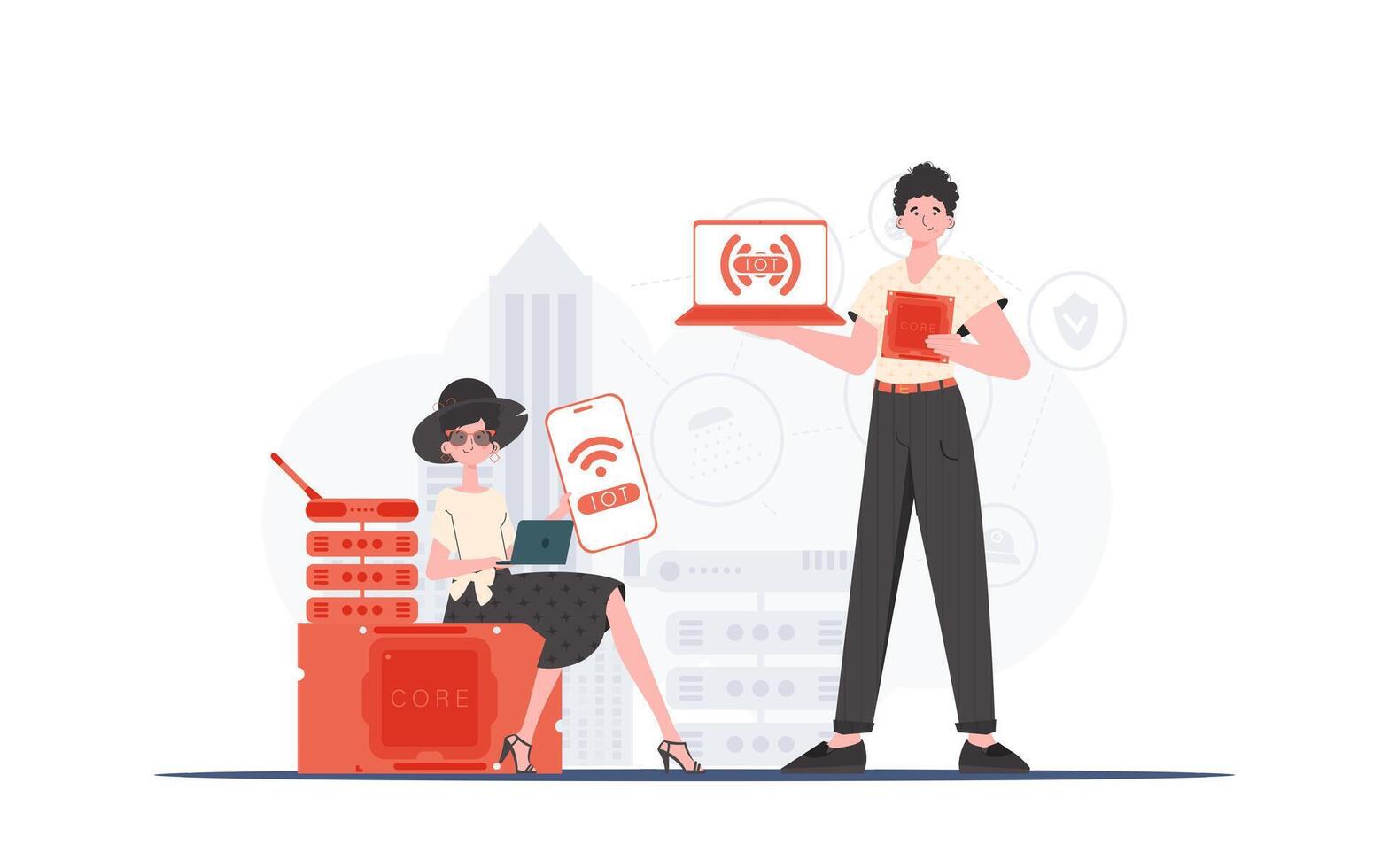 IOT and automation concept. The girl and the guy are a team in the field of Internet of things. Good for presentations and websites. Vector illustration in flat style. Pro Vector