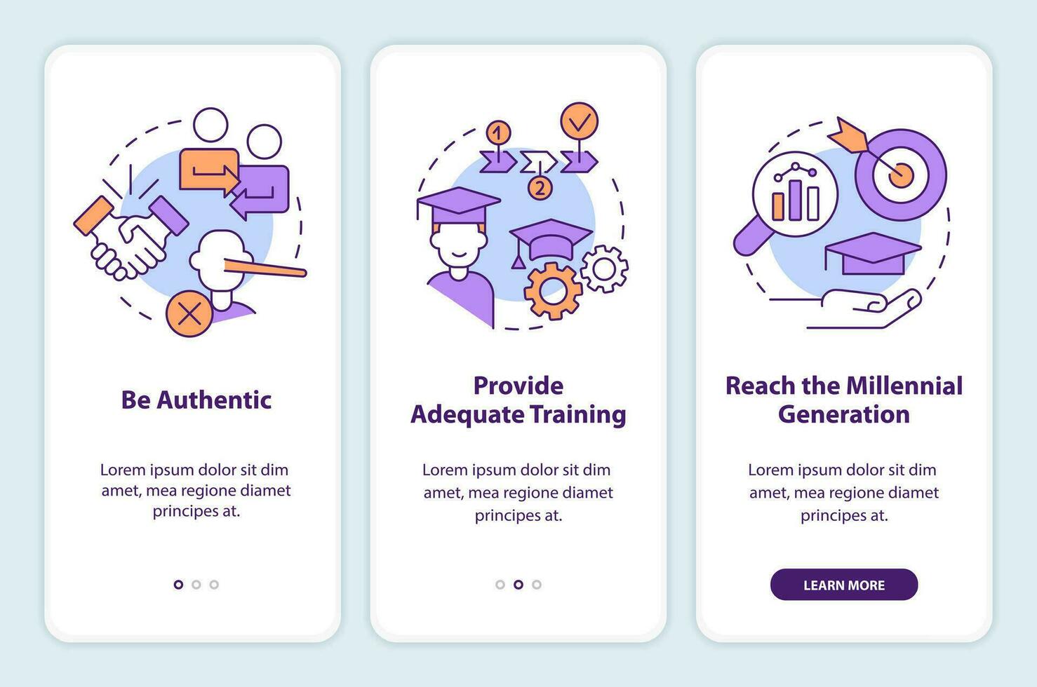 Build strong employer-worker relations onboarding mobile app screen. Walkthrough 3 steps editable graphic instructions with linear concepts. UI, UX, GUI template Pro Vector
