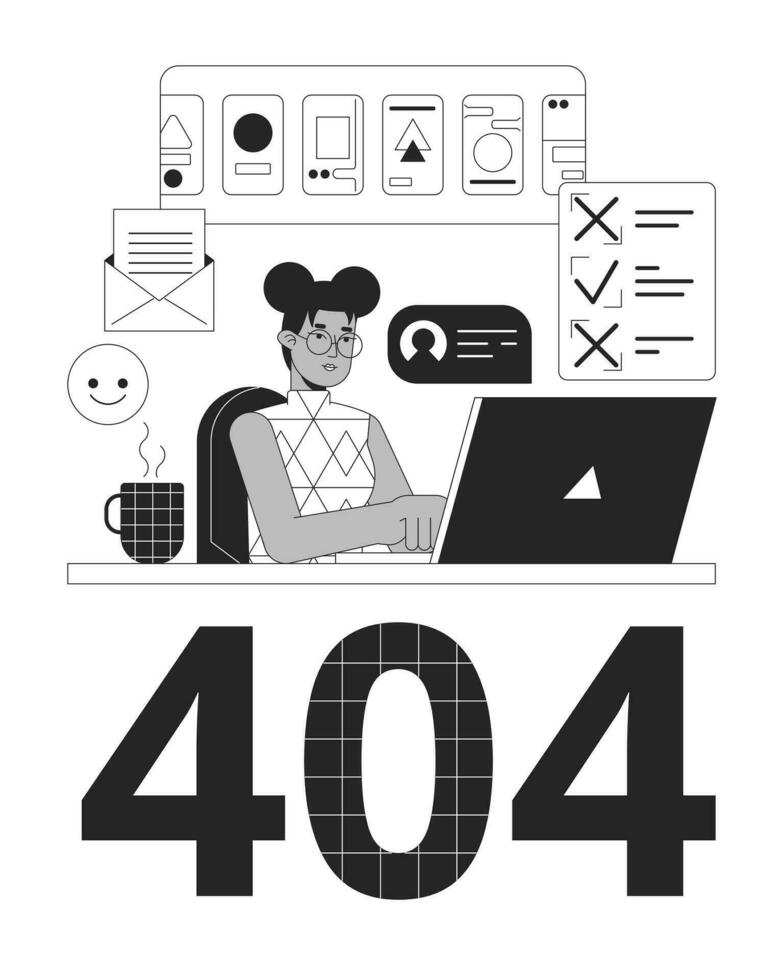 African american girl with many tasks black white error 404 flash message. Remote work. Monochrome empty state ui design. Page not found popup cartoon image. Vector flat outline illustration concept Pro Vector