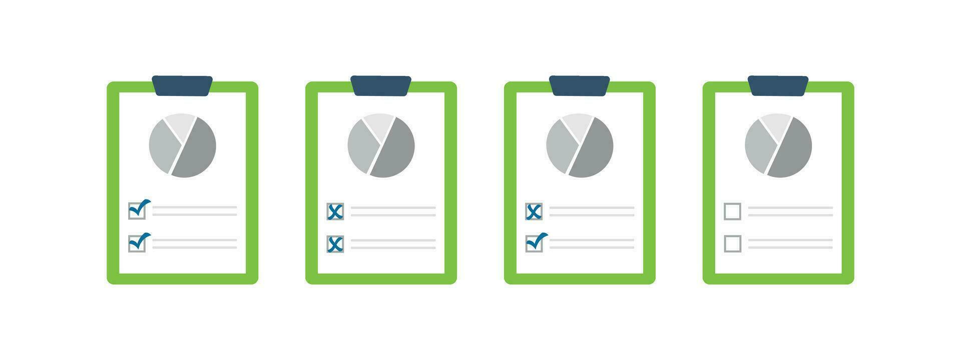 A set of documents with a pie chart, graph marked with a blue check mark and crosses Pro Vector