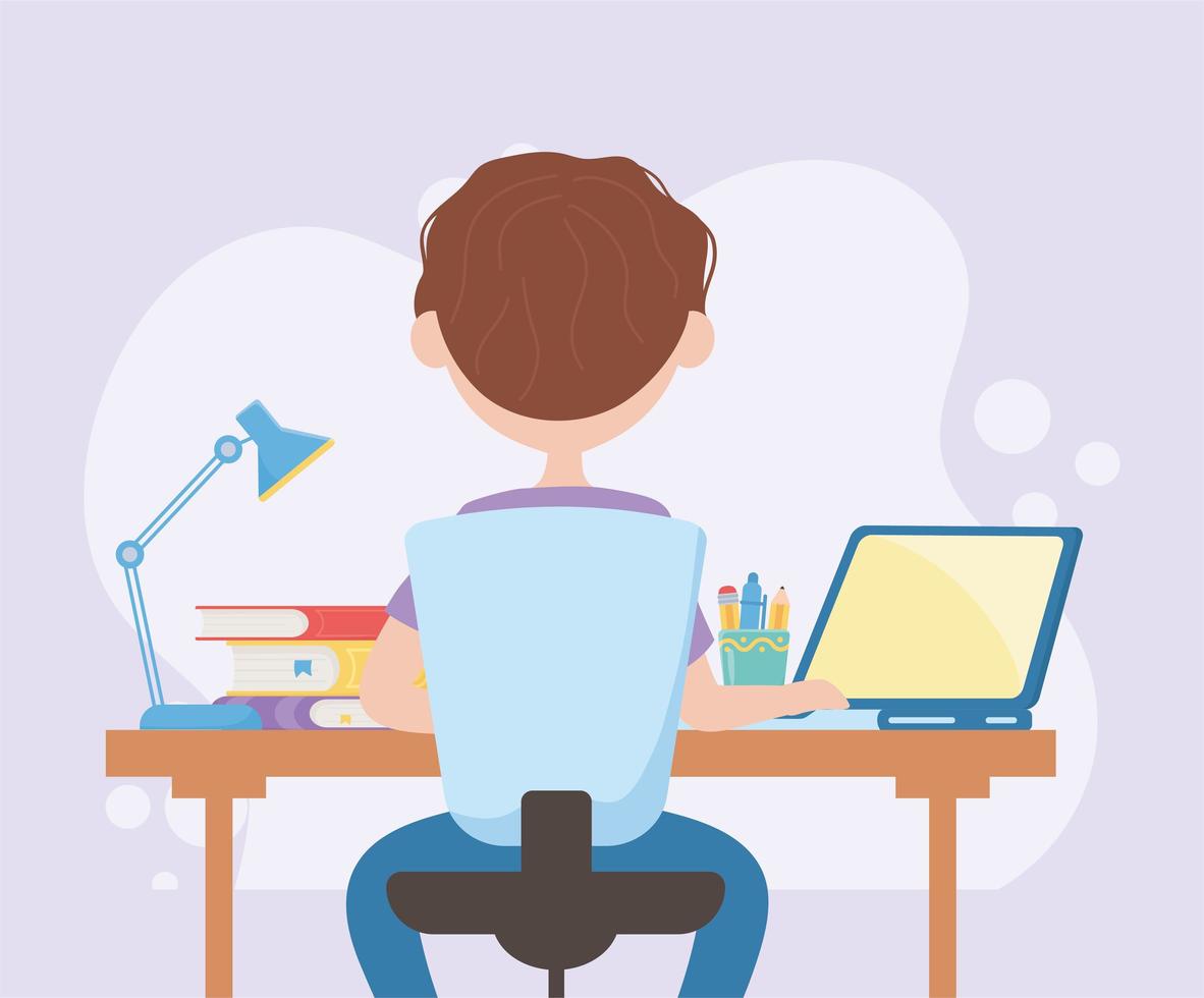 education online student boy typing in computer with books and lamp in desk Free Vector