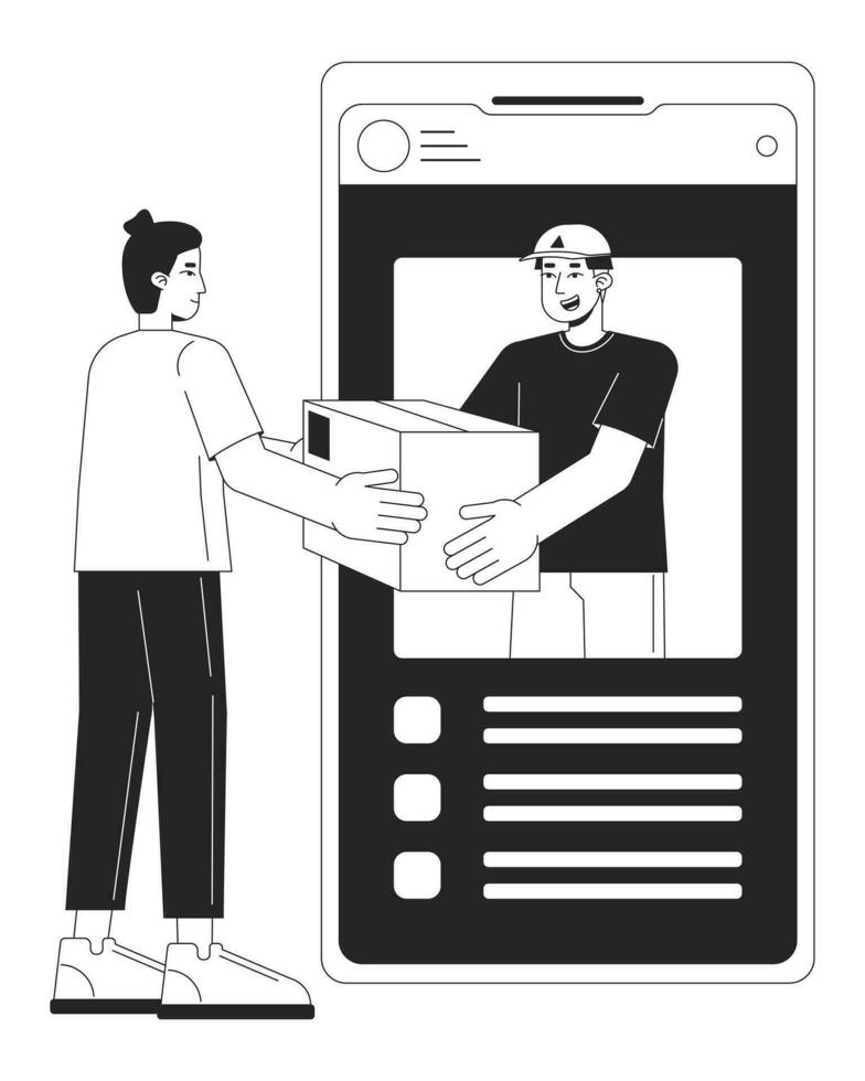 Online package delivery bw concept vector spot illustration. Delivery. Man taking box from courier 2D cartoon flat line monochromatic character for web UI design.editable isolated outline hero image Pro Vector