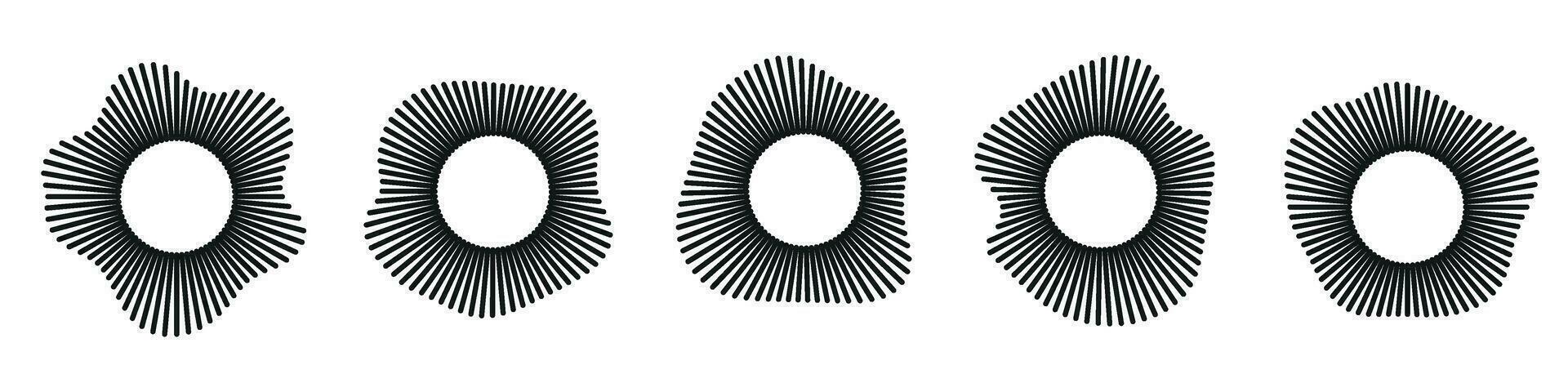 Sound in waveforms, circular designs, circles of audio music, round voices in icons, logos for equalizers, radial spectrum, ring shaped patterns. Flat vector illustrations isolated on white background Pro Vector