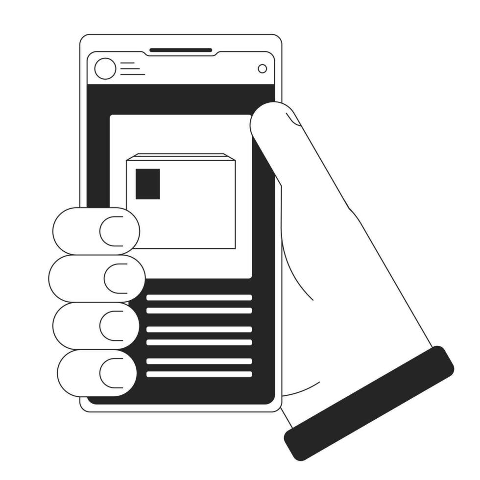 Tracking package bw concept vector spot illustration. Holding smartphone online delivery platform app 2D cartoon flat line monochromatic hand for web UI design.editable isolated outline hero image Pro Vector