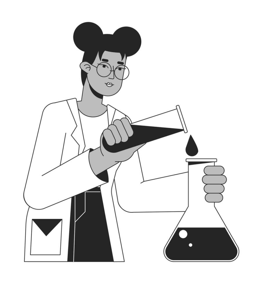 Scientist conducts experiment bw concept vector spot illustration. Pouring liquid into flask 2D cartoon flat line monochromatic character for web UI design. Editable isolated outline hero image Pro Vector