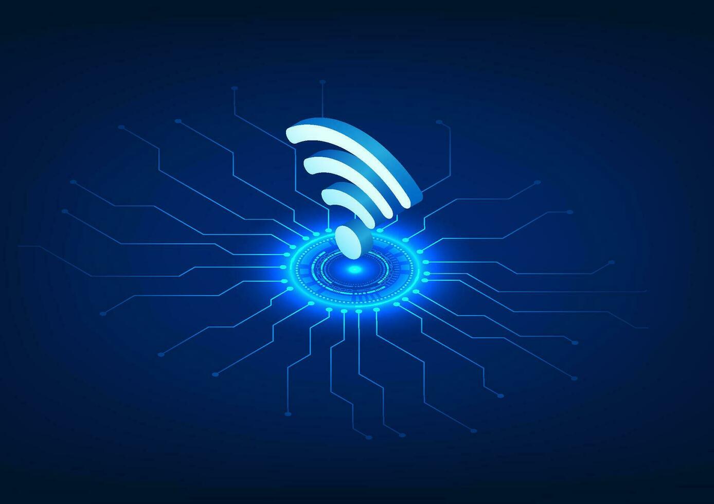 WiFi technology Placed on the technology circle with the connected technology circuit, Wi-Fi is a technology that emits a wireless signal to electronic devices. It is an isometric vector illustration. Pro Vector