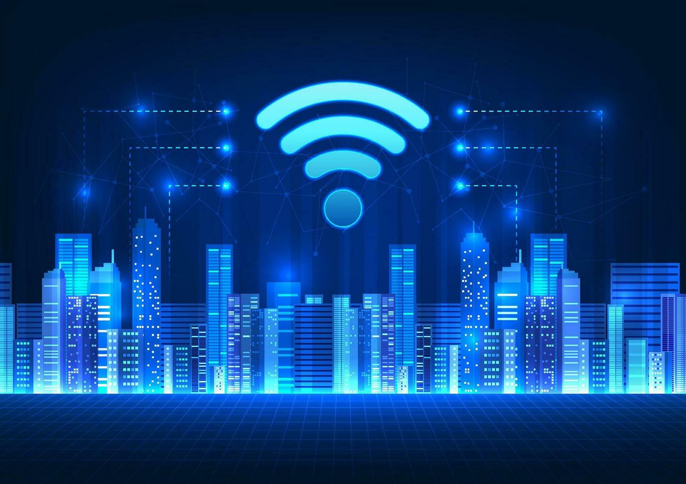 WiFi technology in the smart city with a Wi-Fi icon at the top Refers to the technology of the Internet signal that spreads throughout the city to allow people to access information quickly. Pro Vector