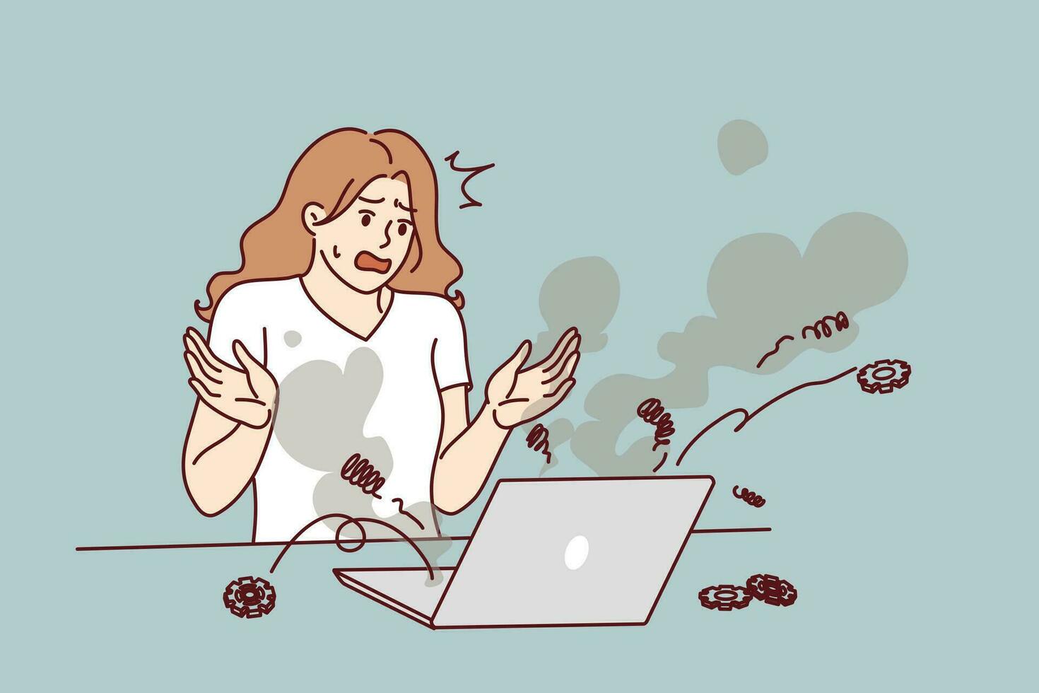 Stressed woman stands near exploding laptop and screams in fear in need of help of computer wizard. Frightened girl calls for help from system administrator after breakdown of portable computer Pro Vector
