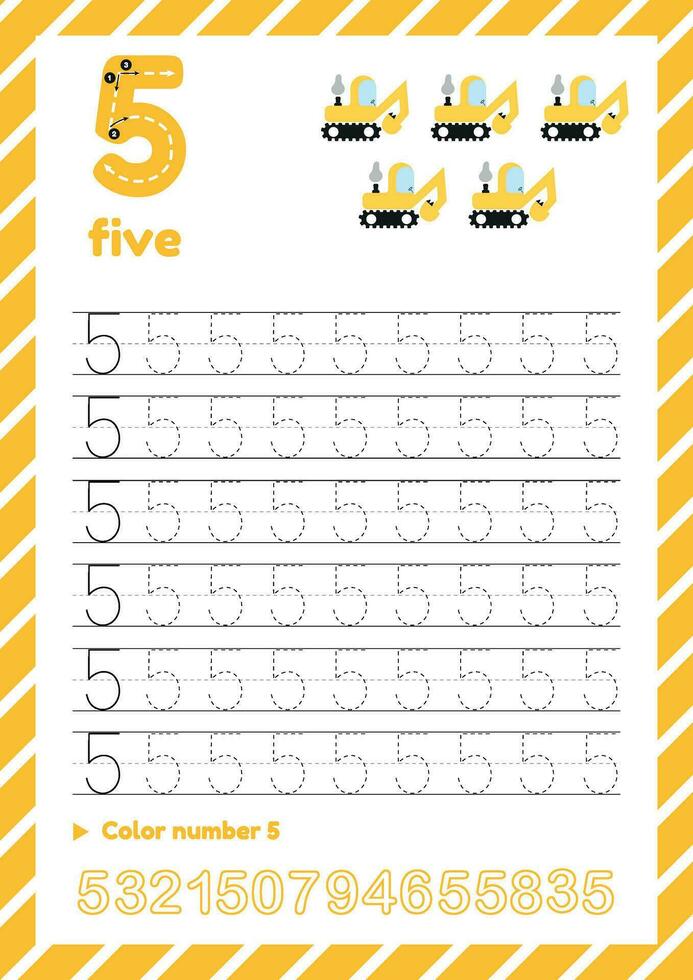 Learn and trace number five. Count excavators Pro Vector