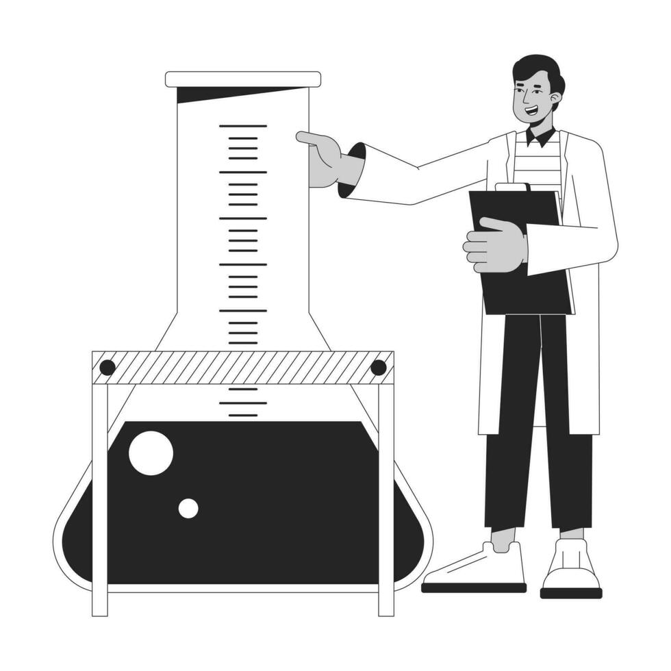 Control of experiment bw concept vector spot illustration. Excited chemist holding big flask 2D cartoon flat line monochromatic character for web UI design. Editable isolated outline hero image Pro Vector