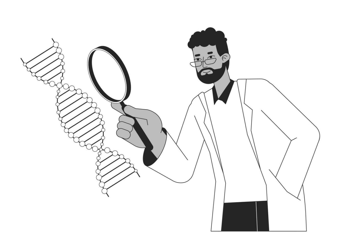 Scientist study DNA helix bw concept vector spot illustration. Biotechnology and engineering 2D cartoon flat line monochromatic character for web UI design. Editable isolated outline hero image Pro Vector