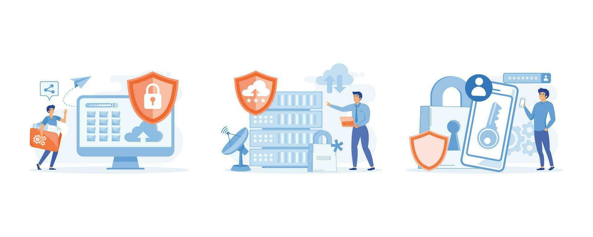 server Security and Data Protection Concept. Online Payment Security, Cloud Shared Documents, set flat vector modern illustration Pro Vector