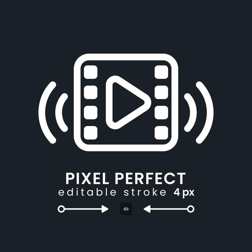 Video streaming white linear desktop icon on black. Social media. Broadcasting content. Online platform. Pixel perfect, outline 4px. Isolated user interface symbol for dark theme. Editable stroke Pro Vector