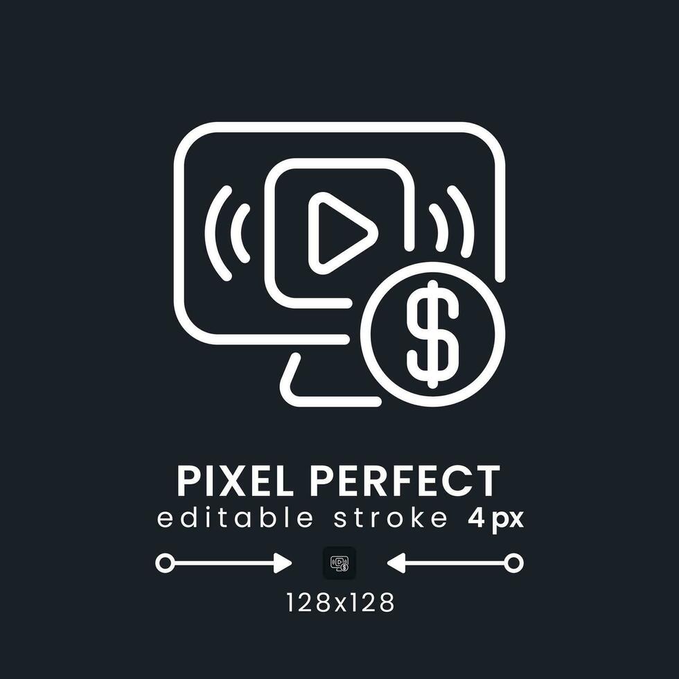 Streaming subscription plans white linear desktop icon on black. Premium content. Ad-free viewing. Pixel perfect 128x128, outline 4px. Isolated user interface symbol for dark theme. Editable stroke Pro Vector