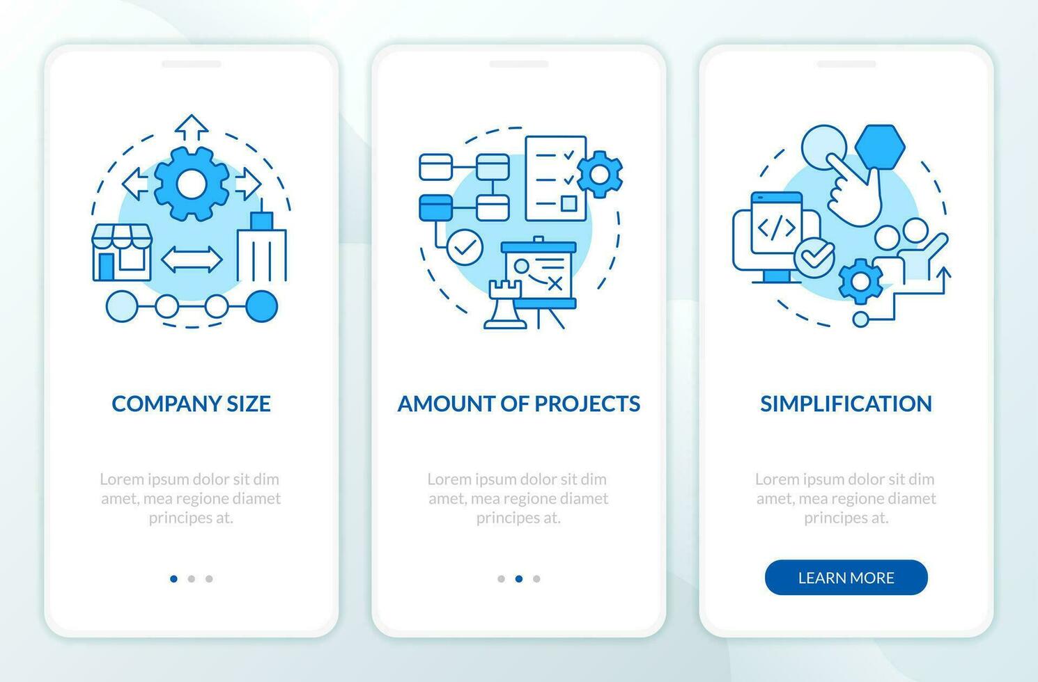 Selecting release management tools blue onboarding mobile app screen. Walkthrough 3 steps editable graphic instructions with linear concepts. UI, UX, GUI template Pro Vector