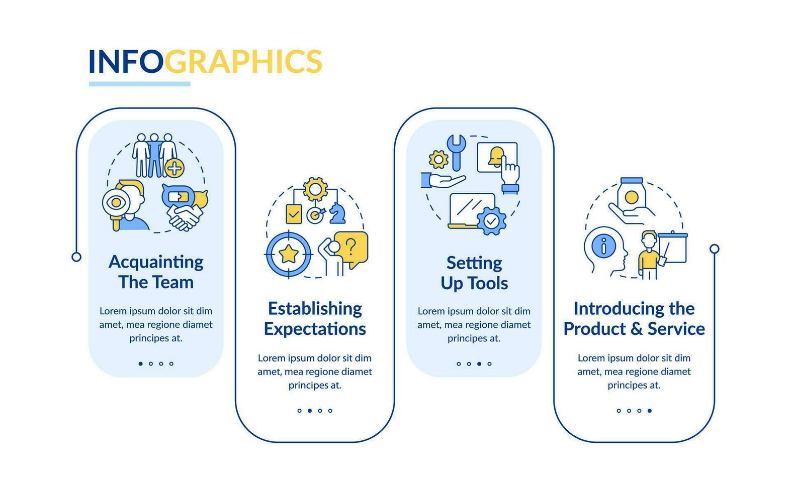 New hire customer service training steps rectangle infographic template. Data visualization with 4 steps. Editable timeline info chart. Workflow layout with line icons Pro Vector