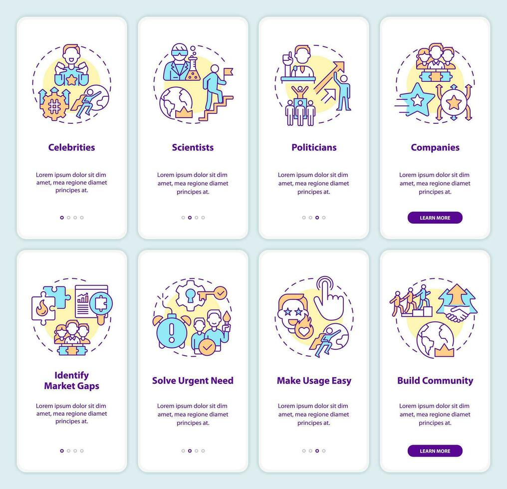 Trendsetters onboarding mobile app screen set. Latest trend walkthrough 4 steps editable graphic instructions with linear concepts. UI, UX, GUI template Pro Vector