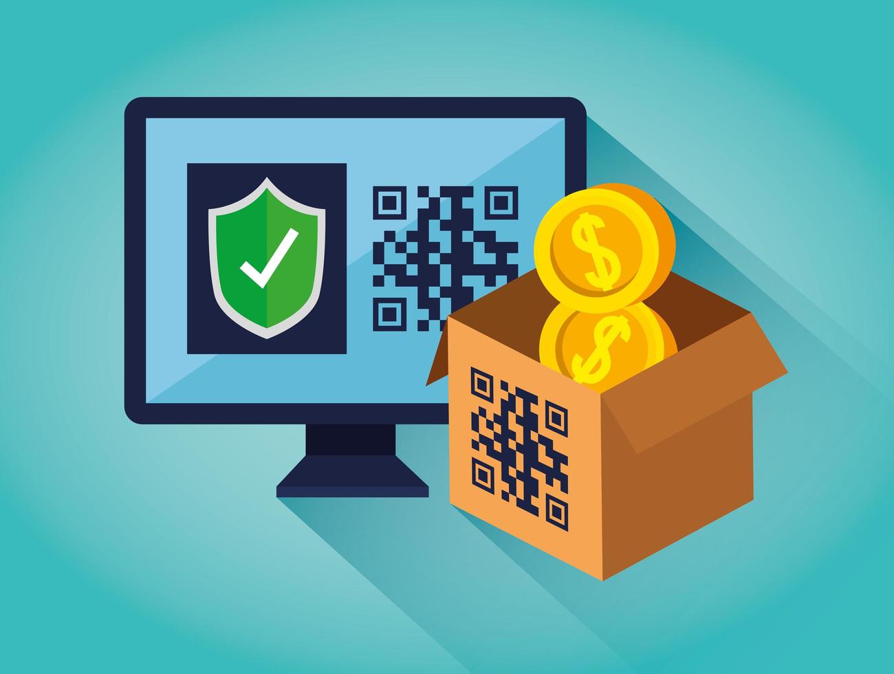 computer and box with code qr Free Vector
