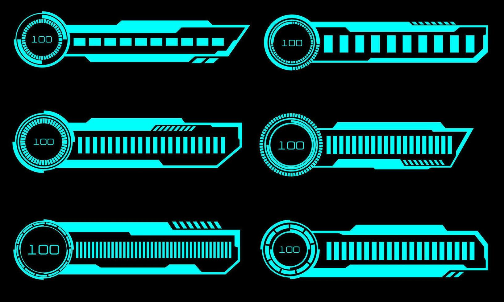 Set of HUD modern loading progress bars user interface elements design technology cyber blue on black futuristic vector Pro Vector